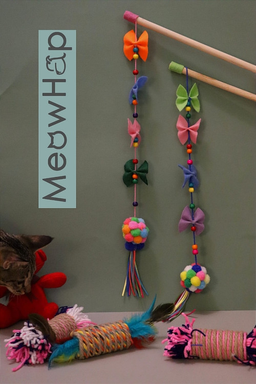 این اسباب بازی از یک توپ پشمی رنگارنگ و نخ های ابریشمی ضخیم و رنگی و جذاب در اندازه استاندارد برای گربه ها تشکیل شده است