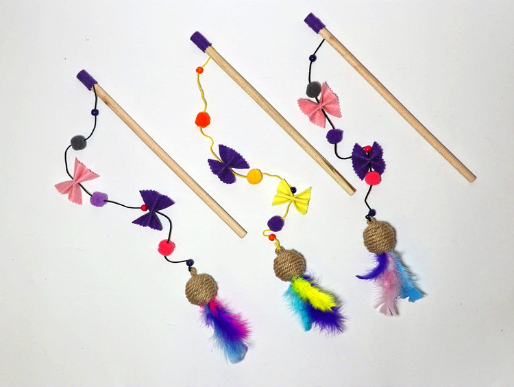 این اسباب بازی از یک توپ با طناب کنفی جهت اسکرچ کردن گربه هنگام بازی و شکار ساخته شده و حاوی سه عدد پر رنگی چذاب جهت تحریک بیشتر غریزه شکار در گربه ها ساخته شده